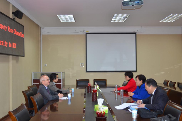 3月21日下午,英国南安普顿索伦特大学副校长Mike Wilkinson教授、国际部教师Sunny Deng一行2人来访我校洽谈两校合作办学事宜。校长刘荣英、副校长张铟、国际交流合作处处长聂鉴锋参加了会谈。