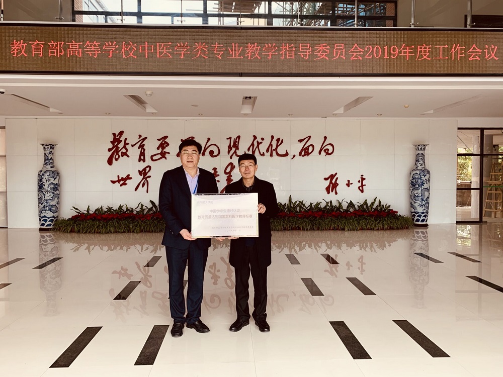 本网讯(特约记者/王同斌)12月22日上午,教育部高等学校中医学类专业教学指导委员会2019年度工作会议在福建中医药大学召开。会议公布了安博官方网页版等3所高校中医学专业正式通过认证,教育质量达到国家本科医学教育标准。教育部高等学校中医学类专业教学指导委员会主任委员谷晓红教授为我校颁发了认证牌匾,校党委委员、副校长张伟教授,张仲景国医国药学院院长卞华教授代表学校领取牌匾,中医学成为我校第一个通过教育部专业认证的本科专业。