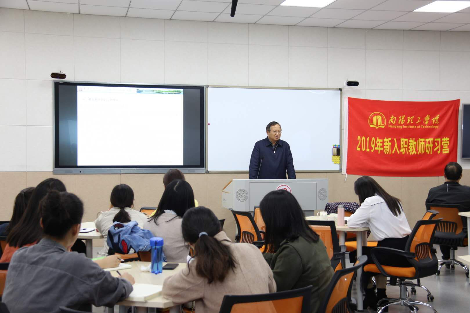 仪式结束后,张世海对新入职教师进行了第一场培训《守初心,担使命,强能力,提素质,做新时代的开拓者——创新转型发展背景下青年教师的成长路径》。他结合“不忘初心、牢记使命”主题教育,强调应用型本科高校青年教师的使命和责任是:培养高素质应用型人才、提高应用型科研能力、提升服务地方经济社会创新驱动发展的能力和水平。如何守初心担使命、提升担当使命的能力,他指出,应该识大局、明大势、转观念、强能力、提素质,尽快融入学校转型发展大潮,做新时代的开拓者。他回顾了学校发展历史、分析了现状、展望了未来,对青年教师提出了六点要求:一是坚定理想信念,坚持立德树人,担负起为党育人、为国育才的时代重任。二是培养“世界眼光”,把握第三次科技革命带来的机遇与挑战,做新时代的开拓者。三是善于思考,抓住机遇,追求卓越,学习不辍,做一个仰望星空和关心世界和国家命运的人,把握自身成长的规律,做优秀的南工人。四是要有大爱之心,关爱帮助每一位学生成长成才。五是做好人生规划,不断提升教书育人、教学、科研、社会服务、工程实践和创新能力,早日成为一个有工程背景的高素质教师。六是践行“不甘示弱”南工精神,秉承“厚德、博学、求真、至善”校训,坚持“立本、立真、立特、立新”理念,确立“以卓越的创新教育与实践造福社会”的共同价值追求。他希望新入职教师尽快融入学校、热爱学校、奉献事业,培养职业道德素养,掌握高等教育基本理论、方法与技能,尽快适应岗位角色,全身心投入高素质应用型创新人才培养,积极参与和推动特色鲜明的高水平应用型理工大学建设。