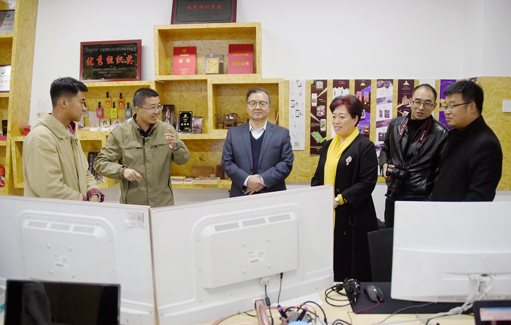 刘荣英一行在兰州文理学院校长郑伟强和相关部门负责同志陪同下,先后考察了该校国家级众创空间——“雁苑微林”众创空间、敦煌文献室、古籍文献室、文化创意展厅、全景式综合演播中心、数字媒体学院运动捕捉实验室、艺术实践教学展演、新闻传播学院教学实验中心和数字媒体学院教学实验中心等。
