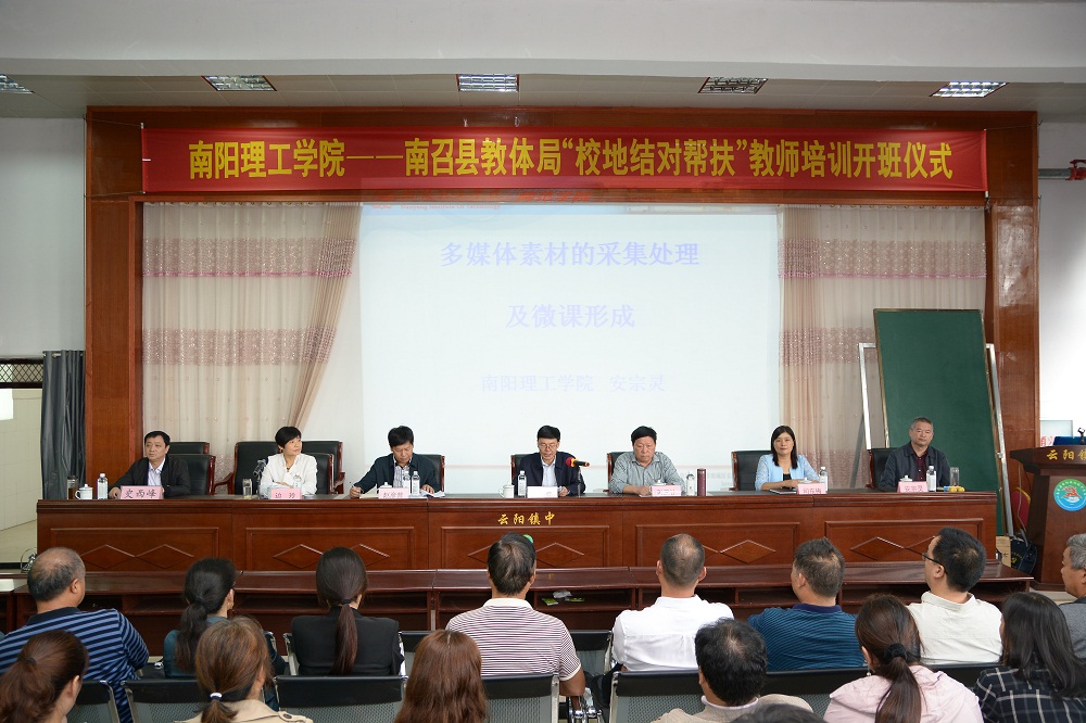 本网讯(特约记者王刚)9月21日,我校与南召县教体局“校地结对帮扶”教师培训在南召县城关一小、云阳镇中同时举行。副校长张伟、肖泽昌,南召县人大主席张三让、县工会主席苗保旺等领导出席开班仪式并讲话。南召县教体局纪检书记边玲主持开班仪式。南召县中小学、幼儿园教师近2000人参加此次培训。