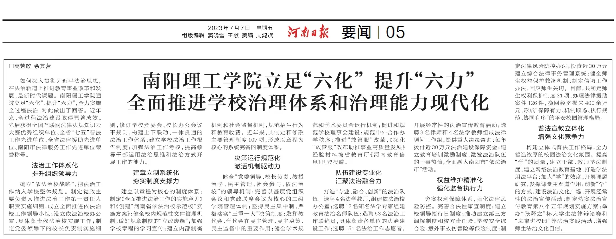 健全以《安博官方网页版章程》为核心的规章制度体系,及时废除、制定、修订各类规章制度343项;完善党委领导下的校长负责制,坚持“党委领导、校长负责、教授治学、民主管理、社会参与、依法治校”领导机制,落实教职工工会和教职工代表大会制度及学生代表大会制度,加强学术委员会建设,学校内部治理结构进一步完善;深入实施依法治校战略,先后荣获全国互联网法律法规知识云大赛优秀组织单位、全省普法工作先进单位、南阳市“七五”普法工作先进集体,“1+N”五维并举主题普法教育活动获全省校园法治文化品牌项目;深入开展数据治理,建立“一站式网上服务大厅”,优化网上办事流程,建成“全域覆盖、全集抽取、全程管理、开放服务、隐私计算”高水平数据治理体系,与市公安局联合成立南阳市网络安全监控预警中心,连年获得省教育系统网络安全和信息化工作先进集体。国家产教融合大楼、东校区及人才公寓先后建成并投入使用;聚焦民生热点,改善社区环境,推广节能减排,先后获批“河南省高校后勤信息化建设先进单位”、全国“公共机构水效领跑者”称号。(校对/鲁静薇 编辑/肖邓华 审核/逯忆)