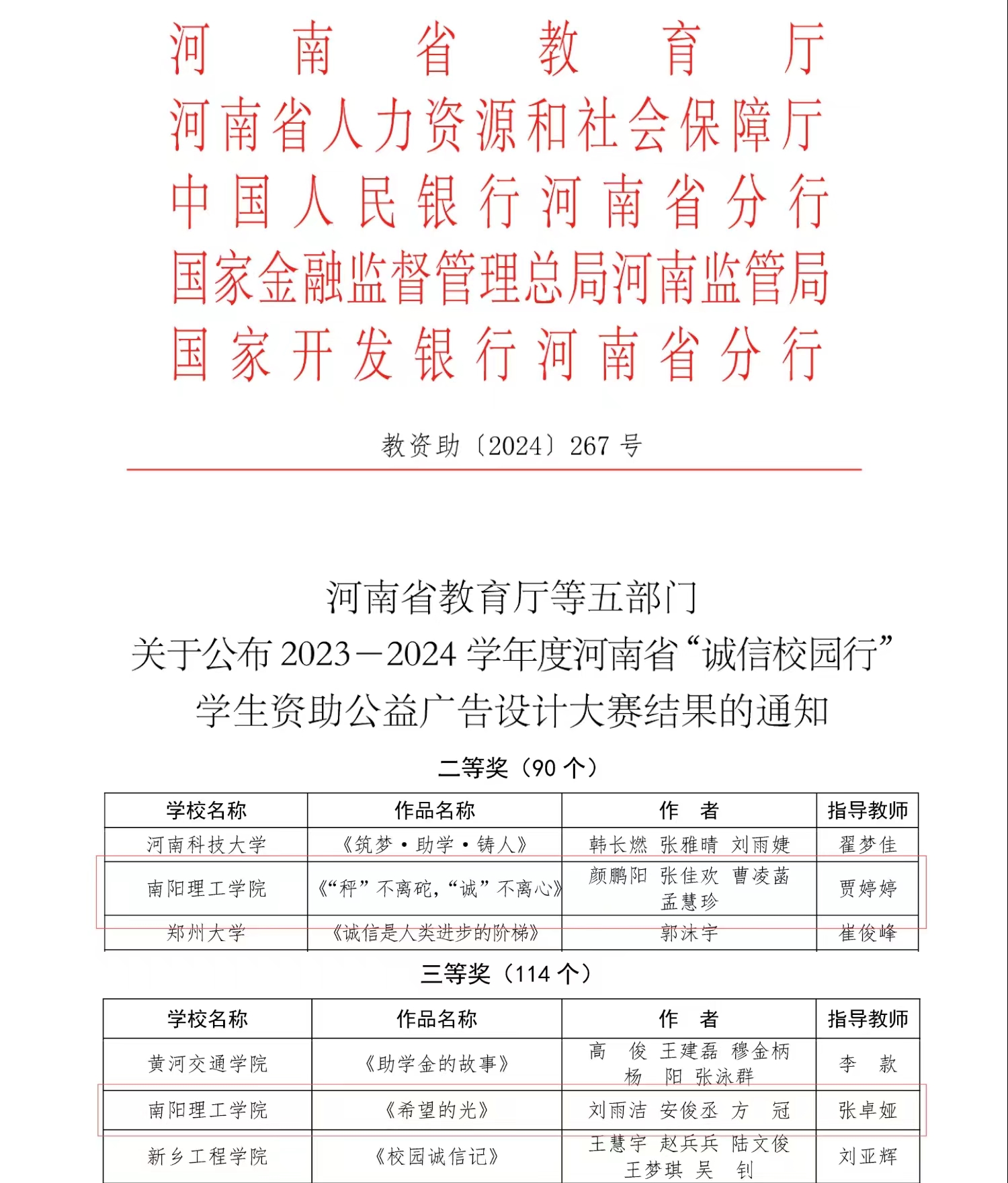 本网讯(特约记者/张启鑫)近日,河南省教育厅等五部门下发《安博官方网页版公布2023-2024学年度河南省“诚信校园行”学生资助公益广告设计大赛结果的通知》,我校选送作品《“秤”不离砣 “诚”不离心》《希望的光》分别荣获大赛平面类二等奖和视频类三等奖。