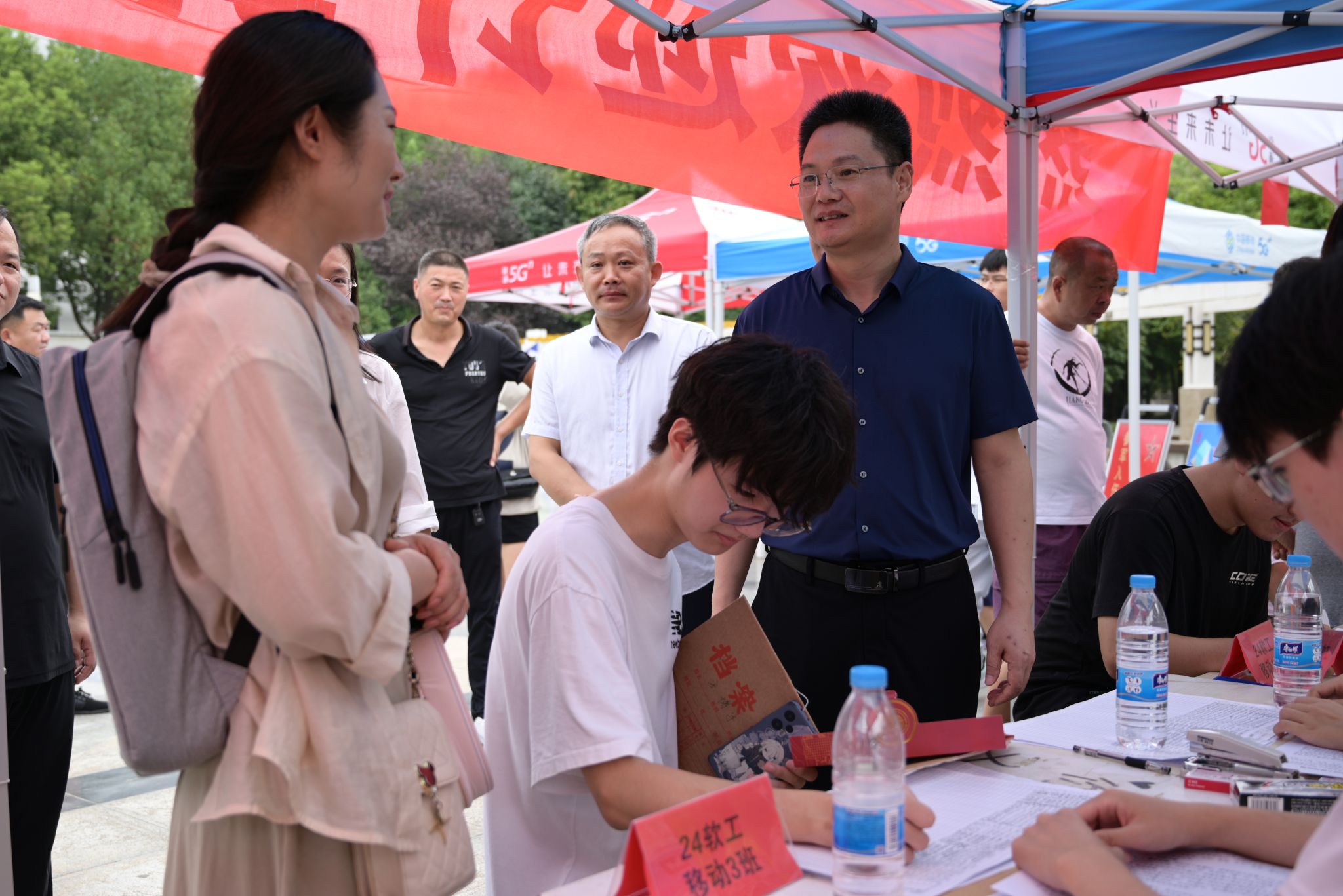 校领导为2024级新生送出温暖南工爱心大礼包并与新生在学校“踔厉奋发启新程 奋楫笃行当先锋”迎新展板前合影留念。(摄影记者/余京龙 校对/刘庚 编辑/肖邓华 审核/逯忆)