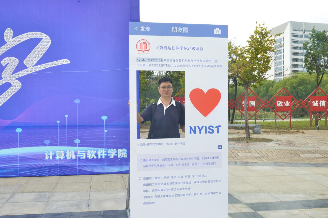 计算机与软件学院:由全体新生名字拼接而成“你好 新同学”主题展板,象征着新学期的美好开端,承载了学院对新生们的殷切期望。同时还设置“朋友圈”打卡墙,记录新生入学第一条新动态。