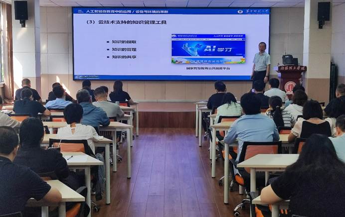 吴军其作“人工智能赋能教育”主题报告,以问卷调查“AI主要帮助自己解决哪些问题”开篇,摸底教师对AI理解和应用情况,讲解人工智能的不同发展阶段和人工智能教育应用现状,结合案例展示人工智能技术在赋能教师专业发展、助力教学优化和科学学习、引领教育评价改革、促进教育智能管理等方面的应用,并向教师介绍不同的智能教学平台和智能教学工具来辅助教学。