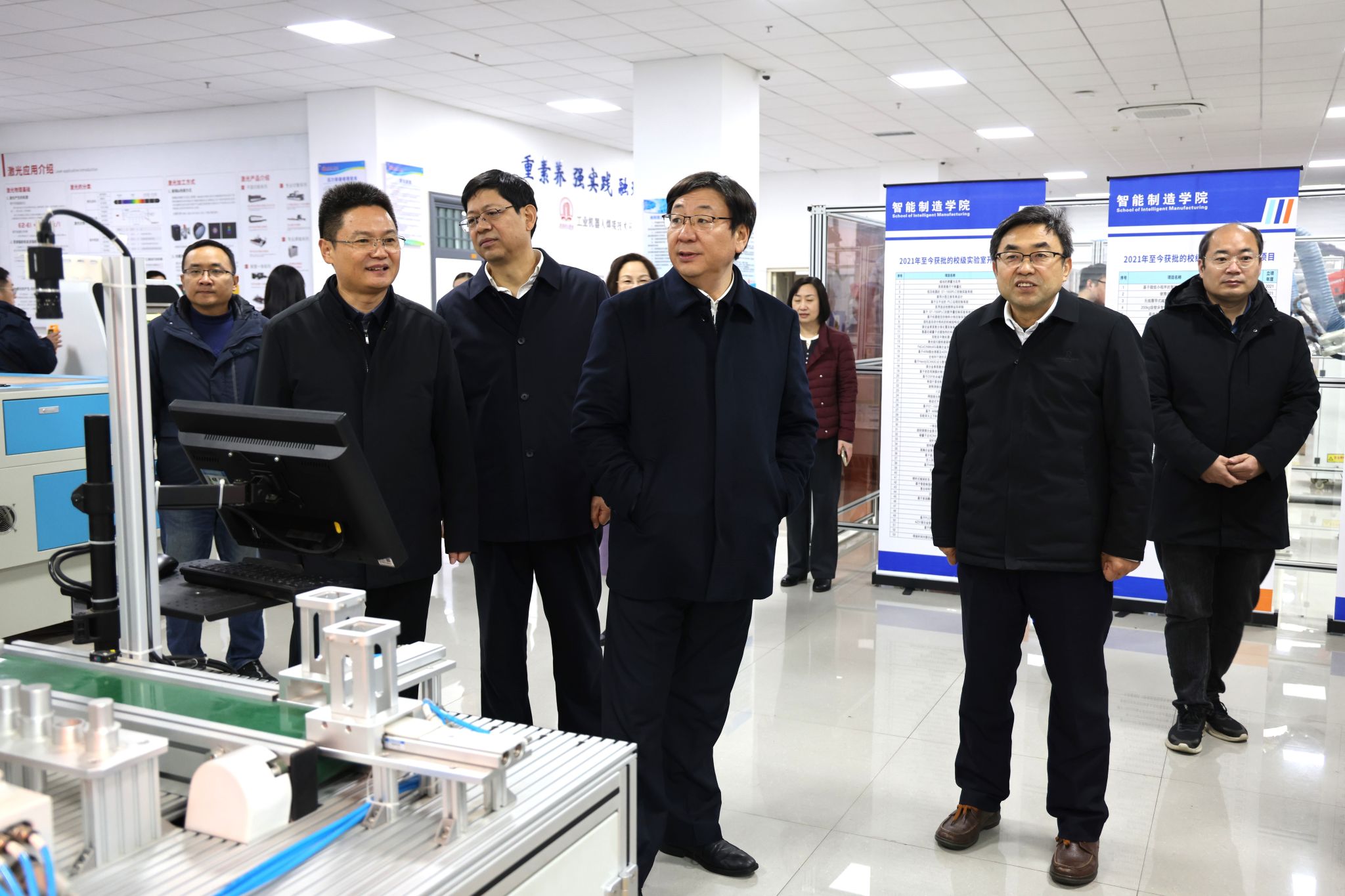 朱自锋一行先后考察计算机与软件学院大学生科技园、数字媒体与艺术设计学院数字艺术馆、智能制造学院工业机器人焊接实验室、信息工程学院河南省光电子器件设计与应用工程技术研究中心等。每到一处,调研组都认真听取工作人员的介绍,深入了解学校在学科建设、科研创新、产教融合、人才培养以及推进硕士学位授予单位立项建设等方面的情况。