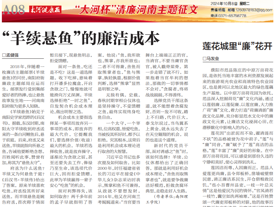 《“羊续悬鱼”的廉洁成本》以史为鉴,通过生动讲述南阳太守羊续的廉洁故事,深刻揭示廉洁自律对于个人品德修养、社会风气净化的深远意义。该作品被《大河健康报》刊登,并被南阳市纪委网站全文转载。