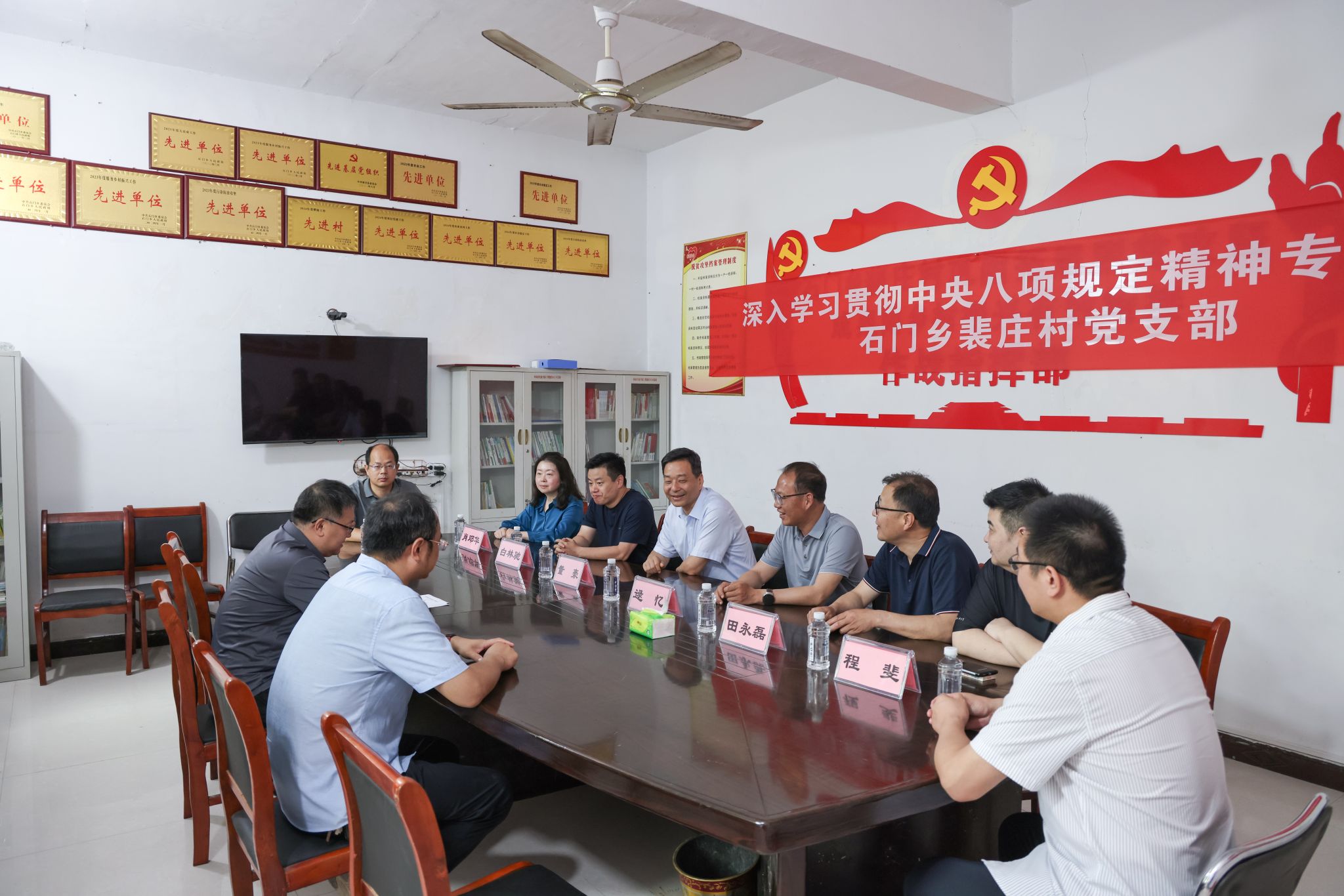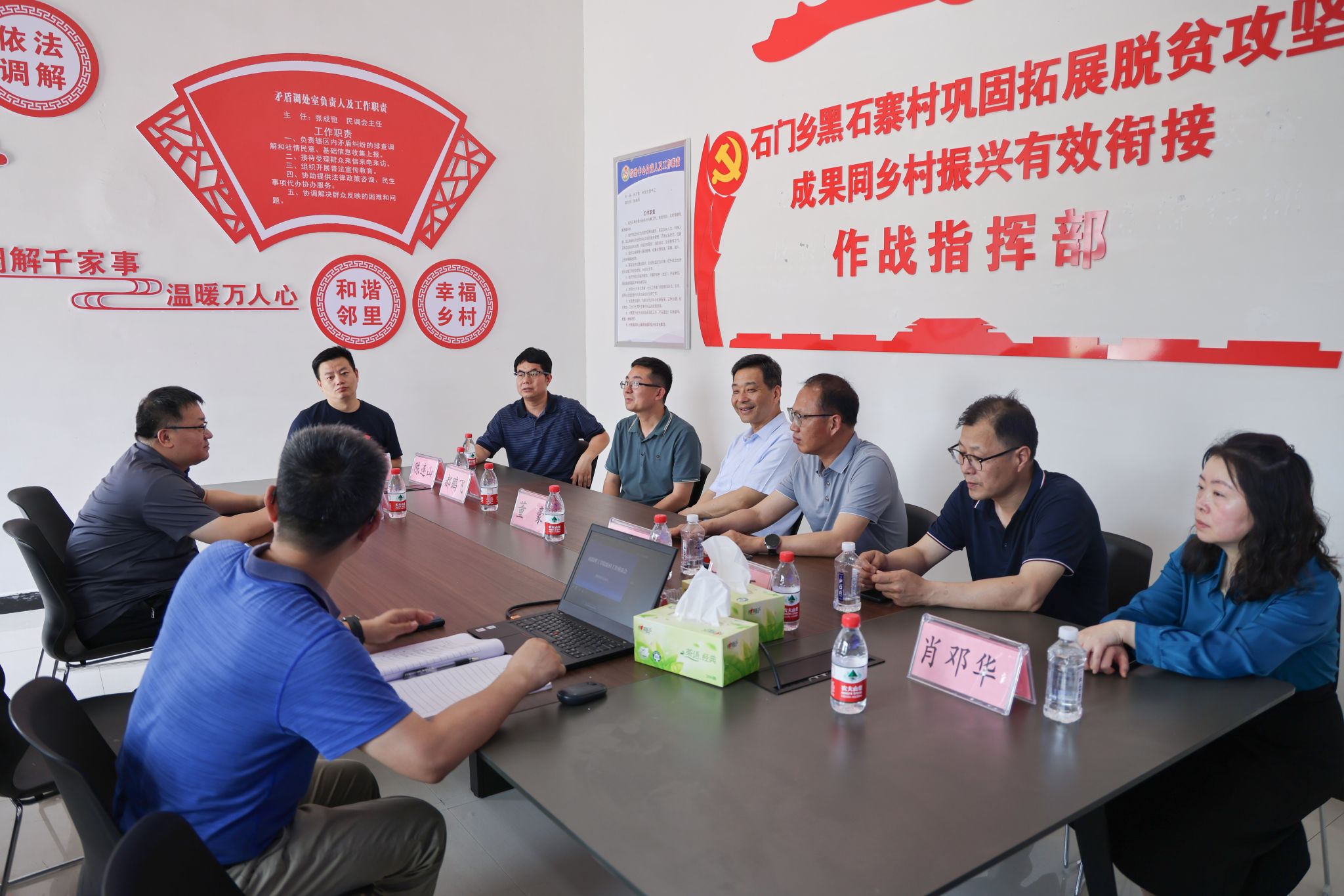 在裴庄村、黑石寨村村部会议室,董豪一行与驻村工作队座谈交流。裴庄村第一书记丁欢和黑石寨村第一书记刘硕分别介绍两村基本情况,重点汇报抓党建促振兴、特色产业发展等工作进展、驻村工作思考体会及下一步工作打算。