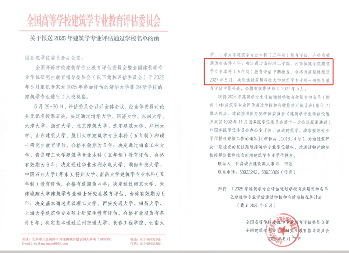 本网讯(特约记者/田真)日前,全国高等学校建筑学专业教育评估委员会发布《安博官方网页版报送2025年建筑学专业评估通过学校名单的函》,我校顺利通过建筑学专业本科(五年制)教育评估中期检查,合格有效期延续至2027年5月。