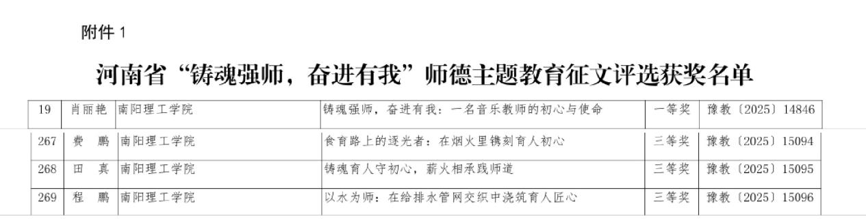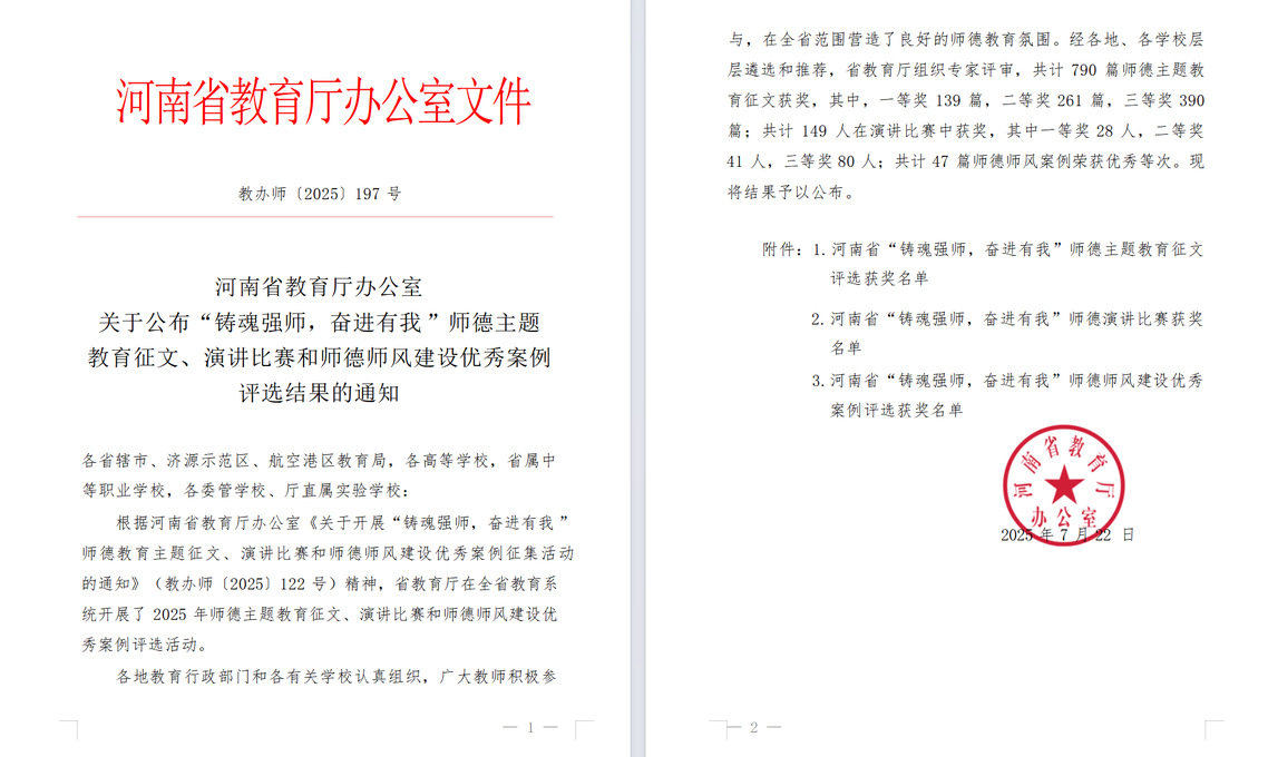 本网讯(特约记者/韦地) 近日,河南省教育厅下发《安博官方网页版公布“铸魂强师,奋进有我”师德主题教育征文、演讲比赛和师德师风建设优秀案例评选结果的通知》(教办师〔2025〕122号),我校多位教师在此次评选中喜获佳绩。