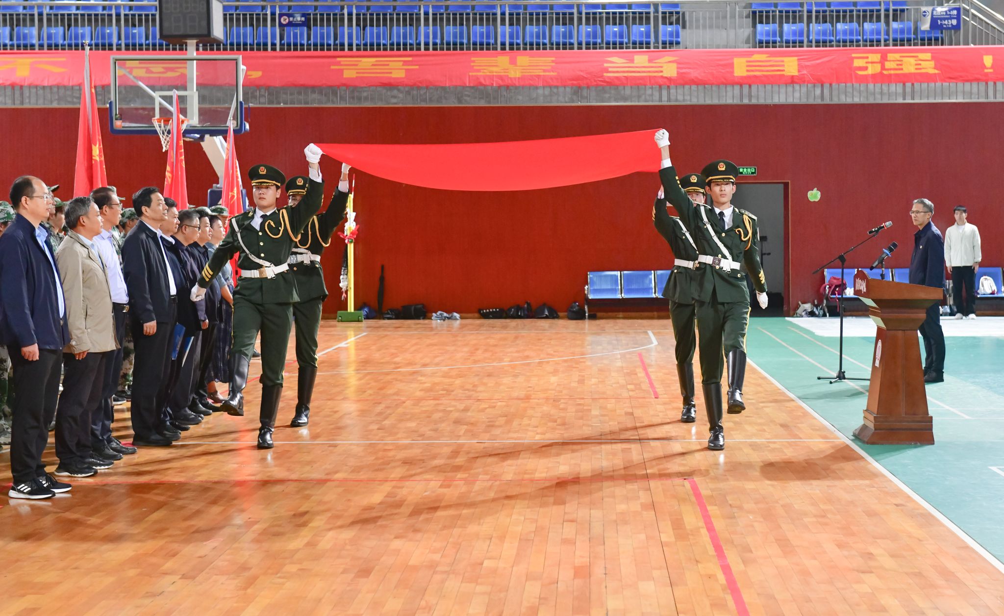 全体师生身着正装,整齐列队,肃立于体育馆二楼活动现场。国旗护卫队步伐铿锵出旗,全体师生肃立高唱国歌,歌声激昂中饱含对祖国的热爱与敬意。