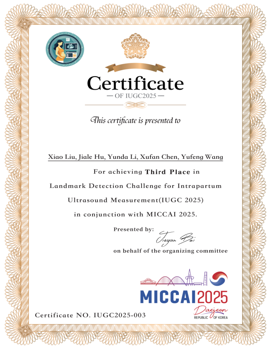 本网讯(记者/王豫峰)9月23日,国际医学影像领域顶会MICCAI(Medical Image Computing and Computer Assisted Intervention)在韩国举办。我校电子信息学科研究院智能计算研究所的王豫峰博士所带领的DL-ICG团队2022级软件工程专业刘肖、胡家乐、李运达和陈许帆同学,在会议发起的分娩胎儿超声关键点检测挑战赛(IUGC),从来自全球知名科研机构和企业的多支参赛队伍中脱颖而出,荣获全球第三名佳绩。