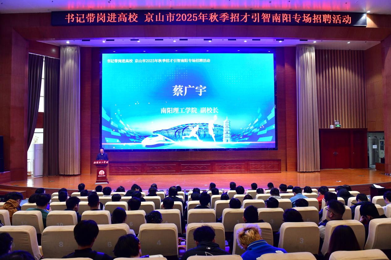 本网讯(特约记者/陈永州)10月23日,由京山市委组织部、市人社局与我校联合主办的“书记带岗进高校——京山市2025年秋季招才引智南阳专场招聘活动”在我校第三报告厅举行。此次活动旨在深入推动产教融合,拓宽毕业生就业渠道,加强校地企合作,助力区域人才发展与经济振兴。我校副校长蔡广宇,京山市委常委、组织部部长谭凌华,以及相关职能部门、企事业单位代表,南阳师范学院、河南工业职业技术学院师生代表等600余人参加。