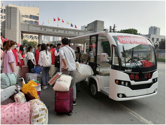 学院相关领导亲临迎新现场,了解目前学生报到情况,实地查看体温检测区、扫码登记区、临时观察区、校园公交接送点、学院报到区及学生公寓等场所,并与报到的新生亲切交谈,详细询问学生的家庭情况、报到是否顺利等情况。