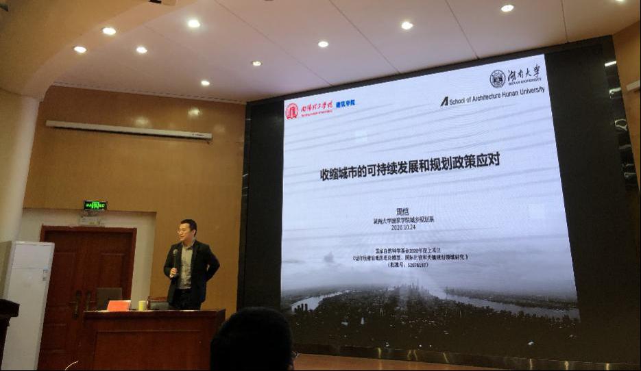 10月24日下午,周恺结合其团队国家自然科学基金项目的最新研究成果,作《收缩城市的可持续发展和规划政策应对》的专题报告,讲座从收缩城市的研究历程、概念辨析、国内外研究综述、动因机制等多个方面做了详细的阐述,并且用大量的图、表、数据展示其团队对国内外城市收缩现象实证研究的成果。