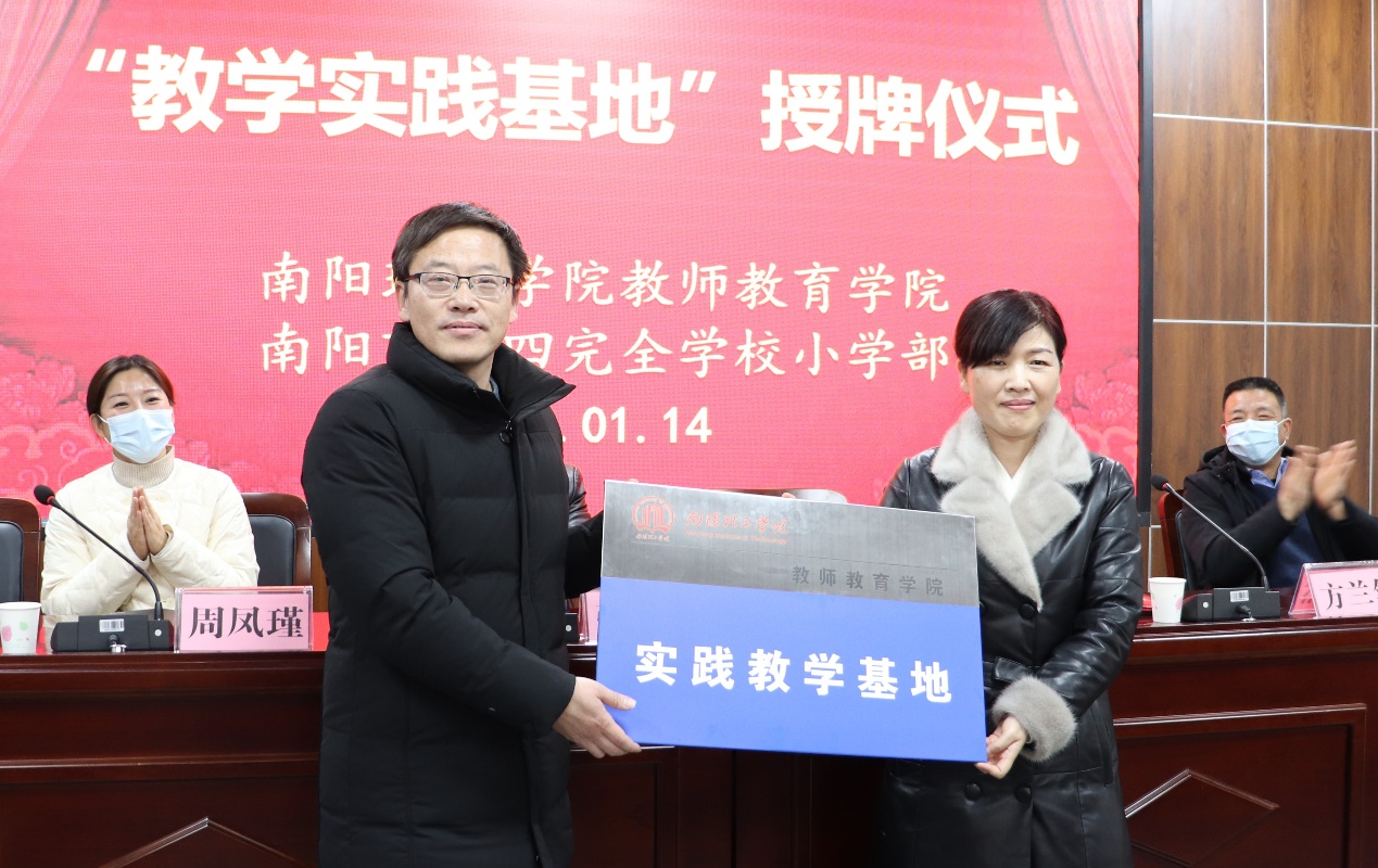 本网讯(特邀记者/王录梅)1月14日下午,教师教育学院院长王岩等一行15人赴南阳市第四完全学校举行教学实践基地签约及授牌仪式,南阳市油田教育中心张廷哲书记、第四完全学校校长刘广廷等校领导出席会议。