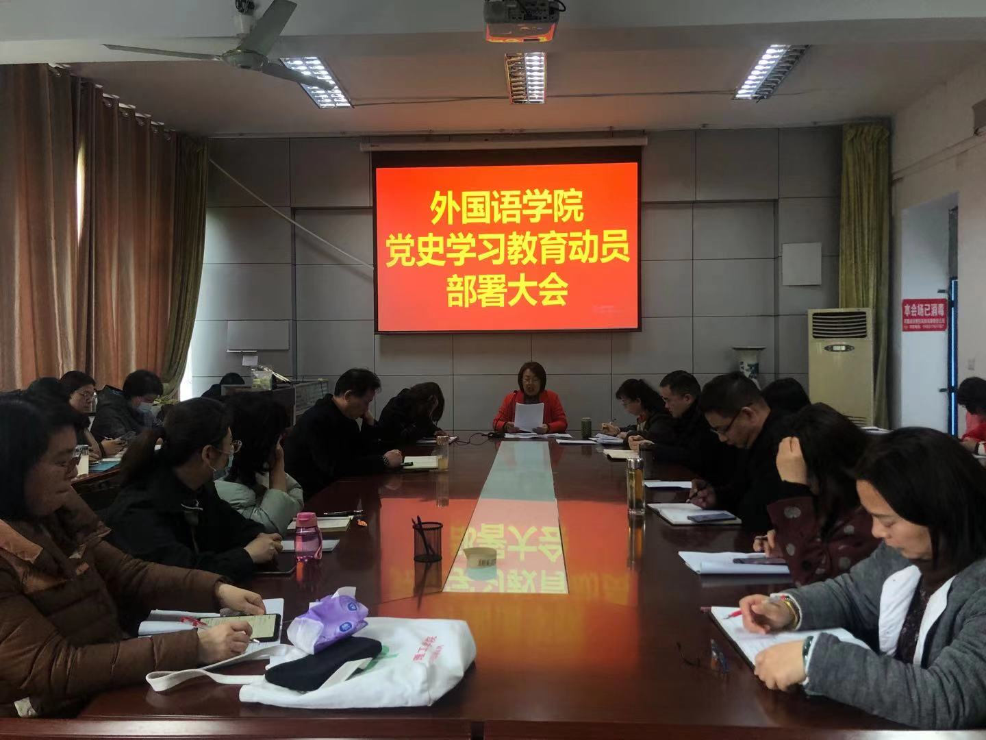 本网讯(特约记者/来蔓均)3月23日下午,外国语学院举行党史学习教育动员部署大会。院长海霞作动员讲话,全院教职工参加会议。