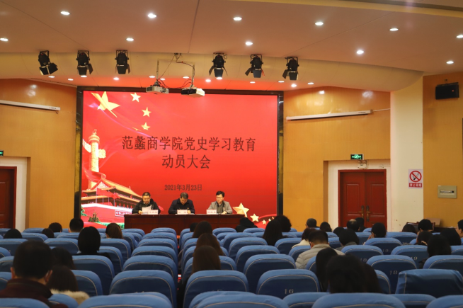本网讯(特约记者/袁梦 褚亦鉴)3月23日,范蠡商学院召开党史学习教育动员会,学院党委书记张良做动员讲话,会议由院长吴战勇主持,全体领导班子、教工党员和科级干部参加。