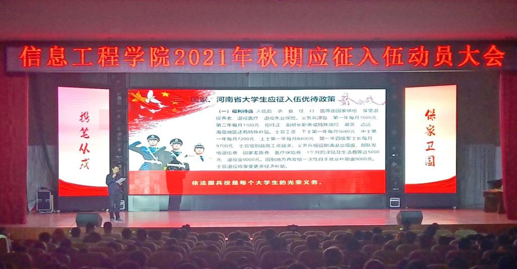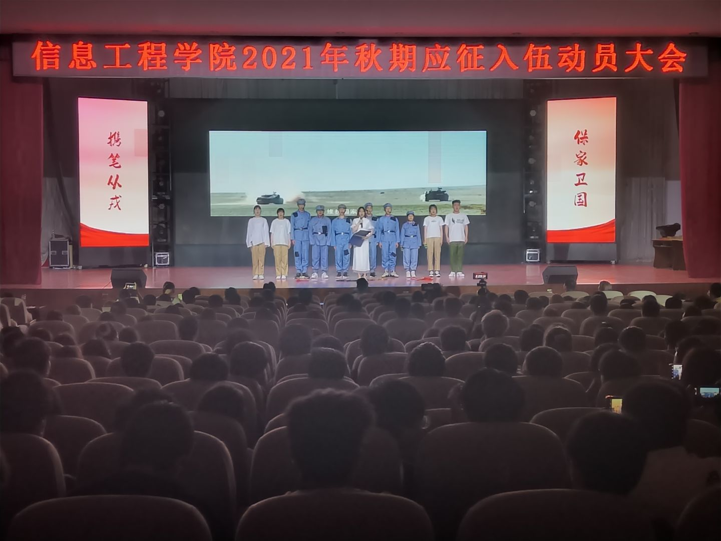 本网讯(特约记者/张露 学生记者/丁奇帅、卢爽)4月29日,信息工程学院在毕业大厅举办2021年秋期应征入伍动员大会,校党委学生工作部、人民武装部、信息工程学院负责人出席大会。