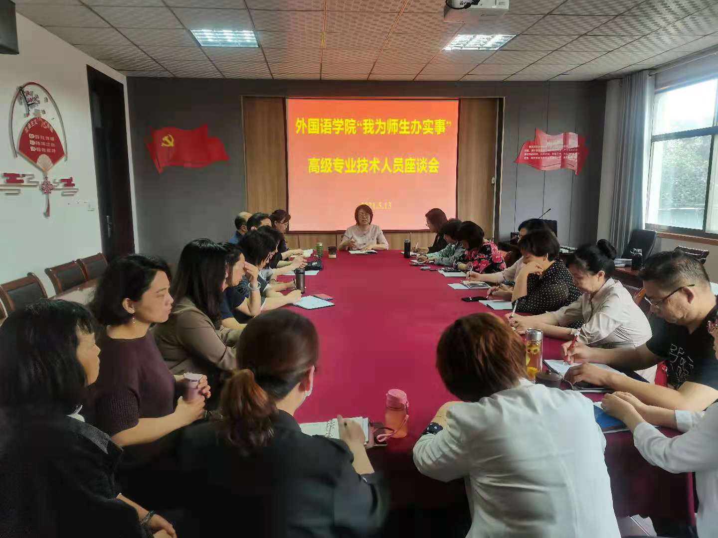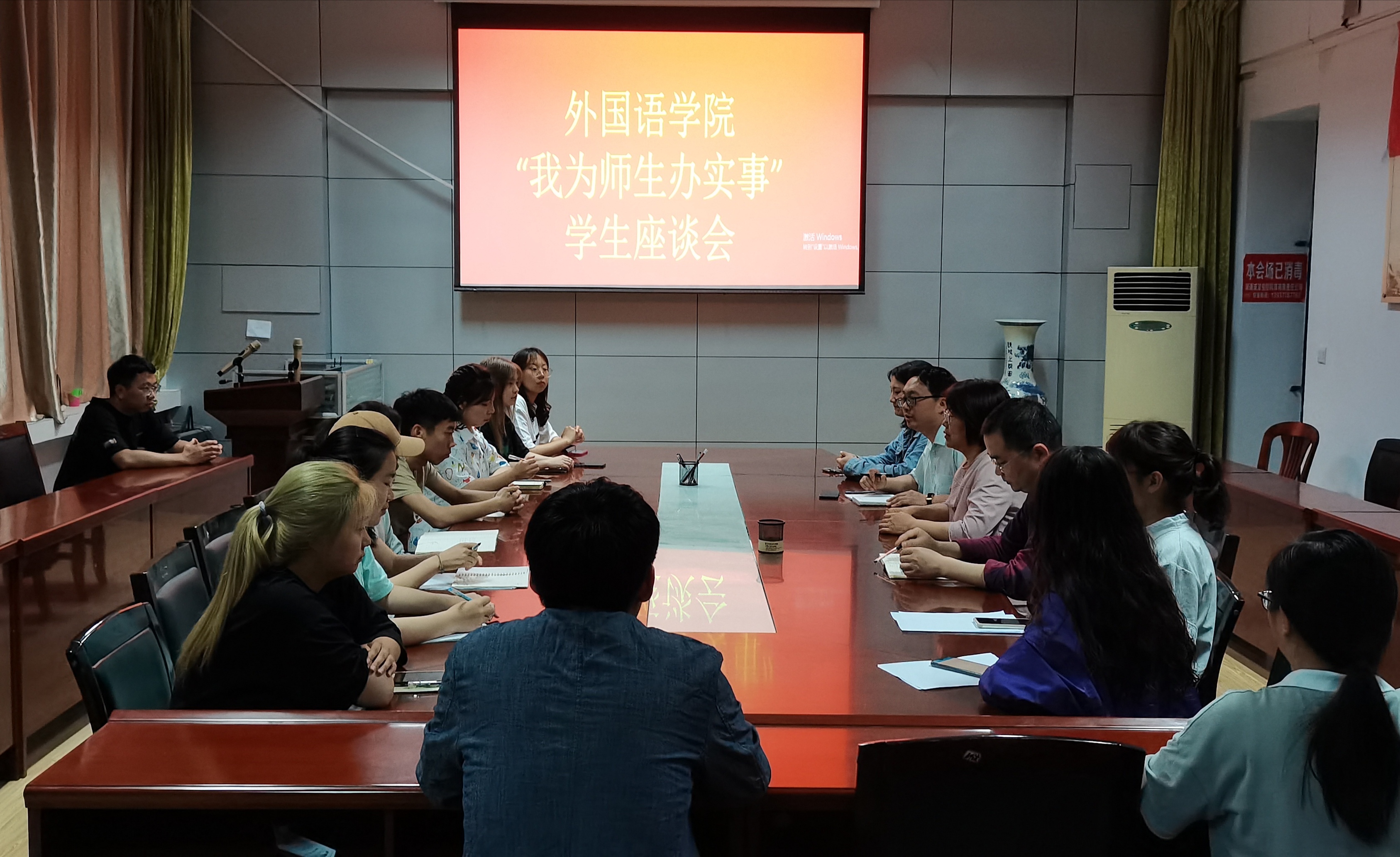 本网讯(特约记者/李鹏飞)5月12日-17日,外国语学院面向高级专业技术人员、博士、学生等不同人群,召开“我为师生办实事”系列座谈会,会议由学院院长海霞主持,全体领导班子参加。