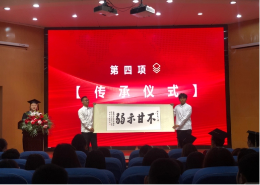 毕业生代表尹思佳从格物致知以及不甘示弱两方面为在校学生分享个人谏言,她代表全体17级毕业生向学弟学妹们赠与了“不甘示弱”四字卷轴,希望同学们能无惧风雨,披荆斩棘,传承“不甘示弱”的南工精神,走过美好的大学四年,走向更有意义的人生。(校对/刘庚 审核/鲁静薇)
