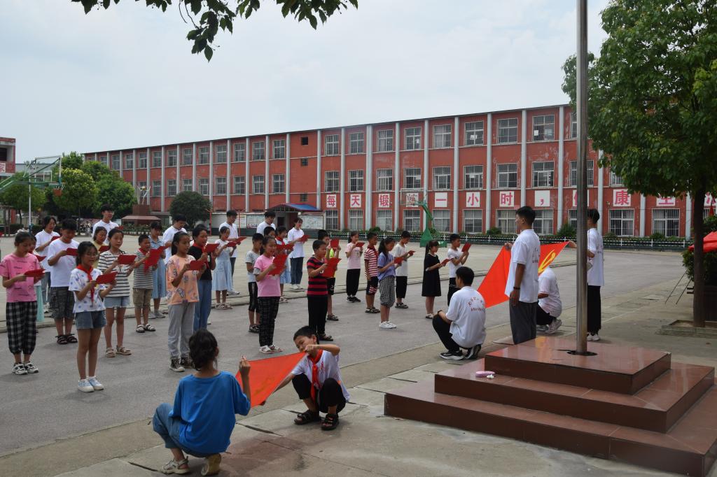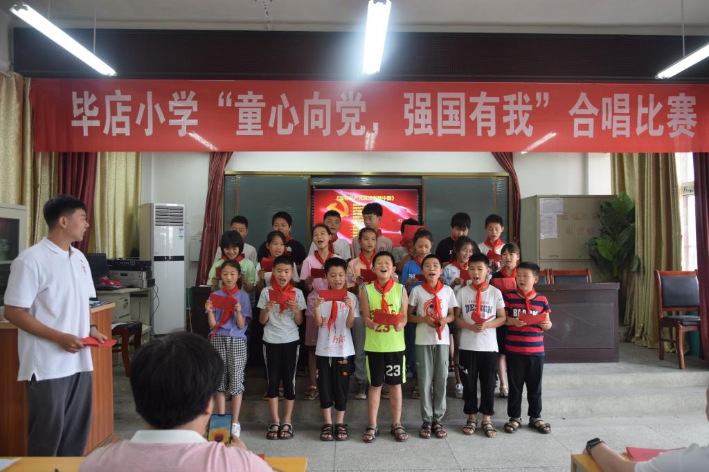 在毕店镇第一小学,实践队员们组织学生开展“童心向党”合唱比赛和“青春献给党”集体致献词活动,在歌声中感受中国共产党的百年征程和中华民族的苦难与辉煌,在铮铮誓言中礼赞建党百年。