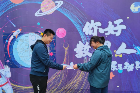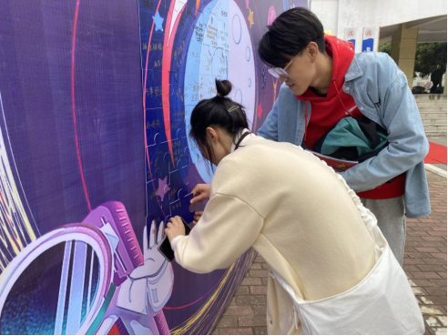 新生每人会分到一块属于自己的拼图,写下大学展望、学习规划等,随后将拼图拼在“探索数理星”展板,象征着新生怀揣着各自理想汇聚成2021级数理大家庭。