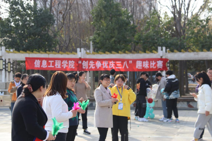 3月8日下午,信息工程学院举办“创先争优庆三八”趣味比赛,学院教职工参加比赛。比赛设置踢毽子、抢板凳、踩气球三个项目。比赛中,女教职工们在各个比赛项目中各显神通,尽展女性风采。