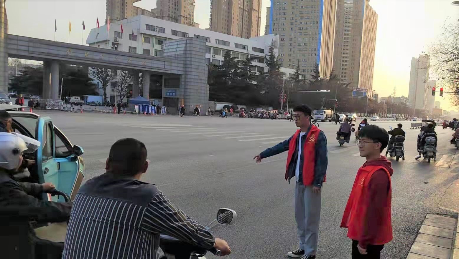 “现在是红灯,请您遵守交规、等候通行”“请您佩戴好安全头盔”“请走人行横道,不要横穿马路”……身着红马甲的交通志愿者在学校北大门协助学校保卫处对过往行人及非机动车闯红灯、逆行、电动车驾驶人未佩戴头盔等不文明行为进行劝导,志愿者的规范引导和文明服务成为校门口的一道美丽风景。
