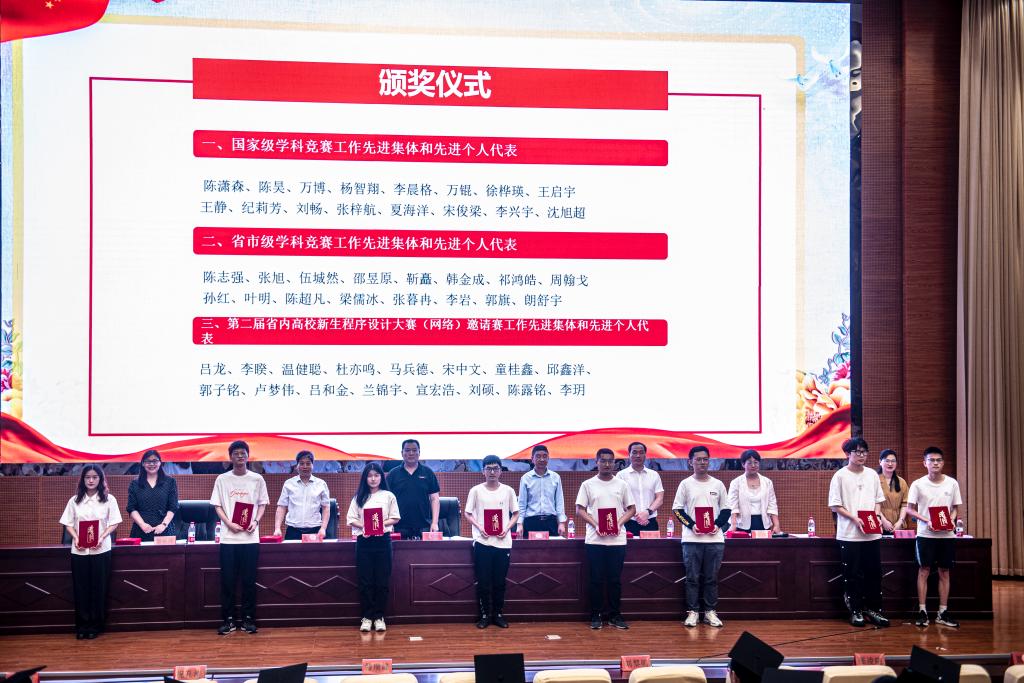 会议宣读了《安博官方网页版表彰计算机与软件学院2021-2022学年学科竞赛暨创新创业工作先进集体和先进个人的决定》,并对学院2021-2022年度学科竞赛与创新创业工作先进集体、先进个人进行表彰。计算机与软件学院ACM集训队总教练靳冰老师作为先进典型代表发言,2021年中国大学生程序设计竞赛获奖者代表李晨格和2021年全省高校“十佳学生社团”大学生科技园学生代表杨勇作为获奖同学代表上台发言。