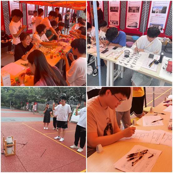 活动现场,同学们手持鸭蛋,自由发挥,大胆运用不同颜色和线条在鸭蛋上画出五彩斑斓的图案,体验制作彩蛋的乐趣;在书法爱好者的指导下同学们写下书法作品,表达美好祝愿;通过现场趣味问答,学习端午知识,感受端午文化。现场还设置古人宴会时礼节性游戏——投壶,参与者将获得艾草、香囊、五色绳等小礼品。