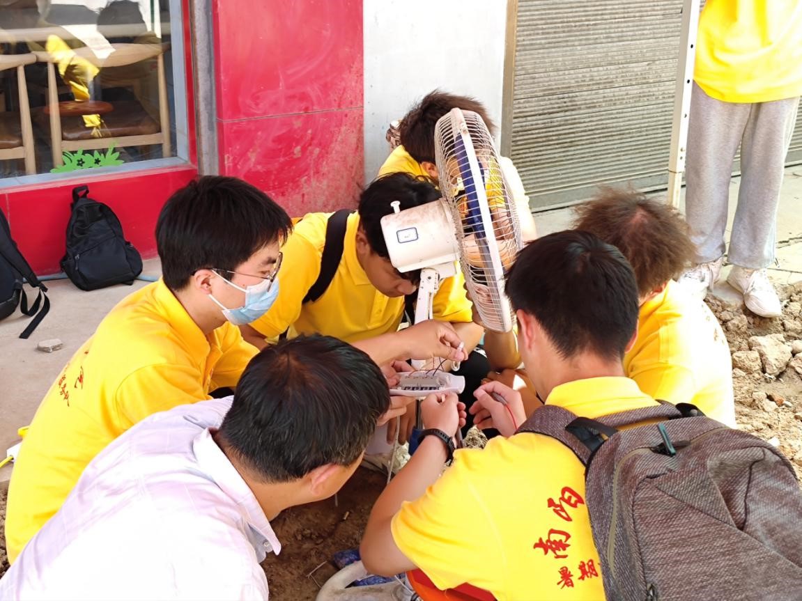 “家电义务维修”服务队抵达镇平县后,服务队分工协作,布置好维修电器的工作棚与维修工具。当地居民陆续将损坏的电风扇、收音机、热水壶等家用电器送来维修。在指导老师和队员的精心修理下,一件件坏家电得以重新运作。同时,服务队队员们还向周围群众宣传安全用电、用电事故预防处理等相关知识。服务队一天内共修理充电器、热水壶、电饭煲等小家电十余件,获得周边群众的肯定和好评。