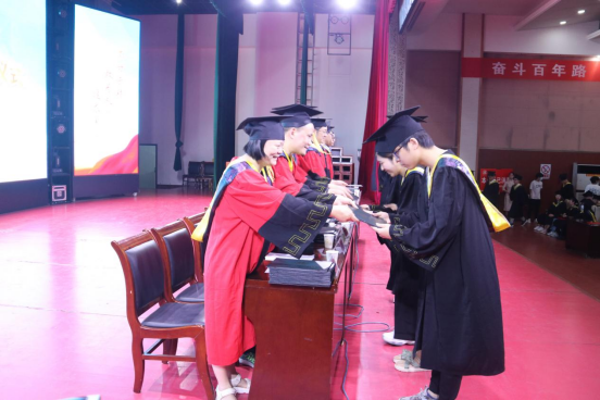 学院学术委员会分会蔡广宇教授和解芳教授为毕业生行拨穗礼并颁发学位证书。