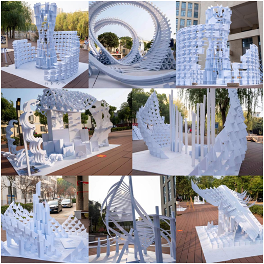 此次大赛主题为“奋进”,参赛选手需要通过指定材料、规定空间和时间,运用建筑学语言表达出“奋进二十大,启航新征程”的设计意境,并使用中空板搭建出1:1:1 的实体模型。各参赛队伍围绕大赛主题,在深入学习领悟党的二十大精神的基础上,创新设计理念,精心创作出“合筑”、“共弦”、“鸿”、“拾级而上”等模型作品,寄托“齐心共筑美好中国”“众人拾柴火焰高”“中国人民万众一心”“中华民族向阳生长”的美好寓意,致敬风雨砥砺中新中国走过的奋进篇章,献礼党的二十大。