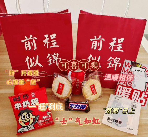 学院主要负责人和学工队伍一同深入考研学子宿舍及自习室,对即将走上考场的考研学子进行考前慰问,嘱咐大家要放松心态、勇敢面对、奋力冲刺,满怀信心地奔赴考场,并为考研学子送上精心准备、祝福满满的“考研加油包”,其中,旺仔牛奶糖和雪饼寓意一“旺”到底;脐橙代表“脐”开得胜,心想事“橙”;士力架表示“士”气如虹;定制可乐象征着可喜“可乐”;蒸汽眼罩意为“蒸蒸”日上;暖贴寓意温“暖”相伴。