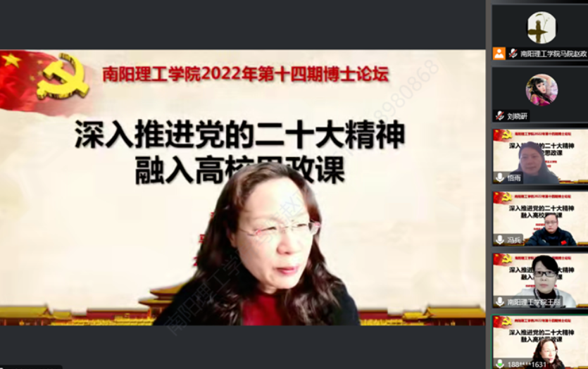 本网讯(特约记者/赵政)12月29日,第十四期博士论坛暨“深入推进党的二十大精神融入高校思政课”学术研讨会以线上方式举行。副校长张爱红教授致辞,四川大学冯兵教授作主旨报告,马克思主义学院负责人及全体博士教师参会并积极发言交流。