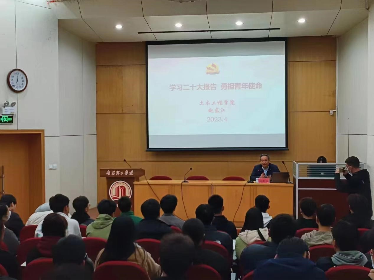 本网讯(特约记者/孙恰)4月23日,土木工程学院党委书记赵东江以“学习二十大报告 勇担青年使命”为主题,为学院入党积极分子讲授深入学习贯彻党的二十大精神专题党课。