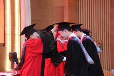 老师们为毕业生拨苏正冠,寓意毕业生们完成学业、获得学士学位。毕业生与辅导员合唱《光阴的故事》,为毕业典礼画上圆满句号。