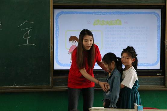 实践队员给孩子们讲解灾难逃生技巧和防溺水知识,并且演示“海姆利克急救法”的场景,增强孩子们对危险的应急处置能力,提高他们的安全防范意识