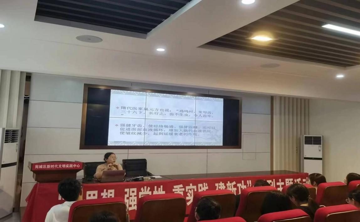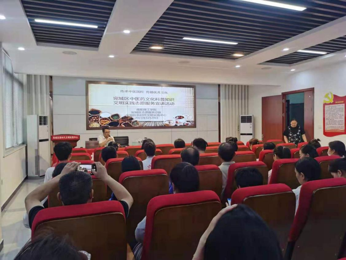 本网讯(特约记者/王旭)为进一步传承中医国粹,弘扬传统中医药文化,帮助广大居民群众养成良好的生活习惯,6月28日,我校张仲景国医国药学院中医教研室教师前往南阳市宛城区新时代文明实践中心开展中医药文化知识科普文明实践志愿服务宣讲活动。