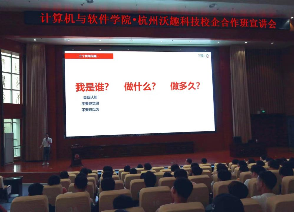 本网讯(特约记者/闫恒瑜)9月18日,计算机与软件学院邀请杭州沃趣科技在我校举办校企合作班宣讲会。学院领导班子成员以及400余名师生代表参加活动。