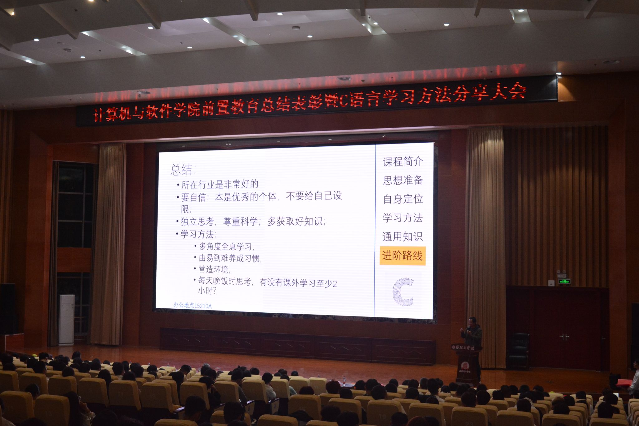 本网讯(特约记者/陈可)10月18日晚,计算机与软件学院举行前置教育总结表彰暨C语言学习方法分享大会。学院领导班子成员、教师代表、受表彰学生及新生代表参加大会。