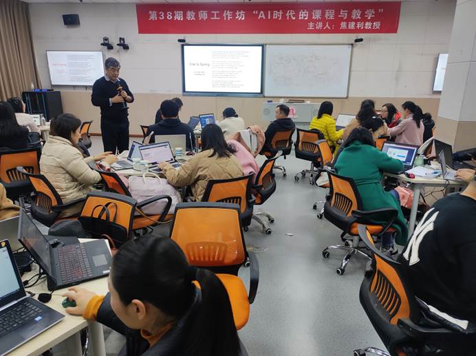 本网讯(特约记者/李孟)11月12日,华南师范大学博士生导师焦建利教授应教师教学发展中心邀请做客第38期教师工作坊,为我校教师进行“AI时代的课程与教学”主题培训,校内40余名教师参加工作坊。
