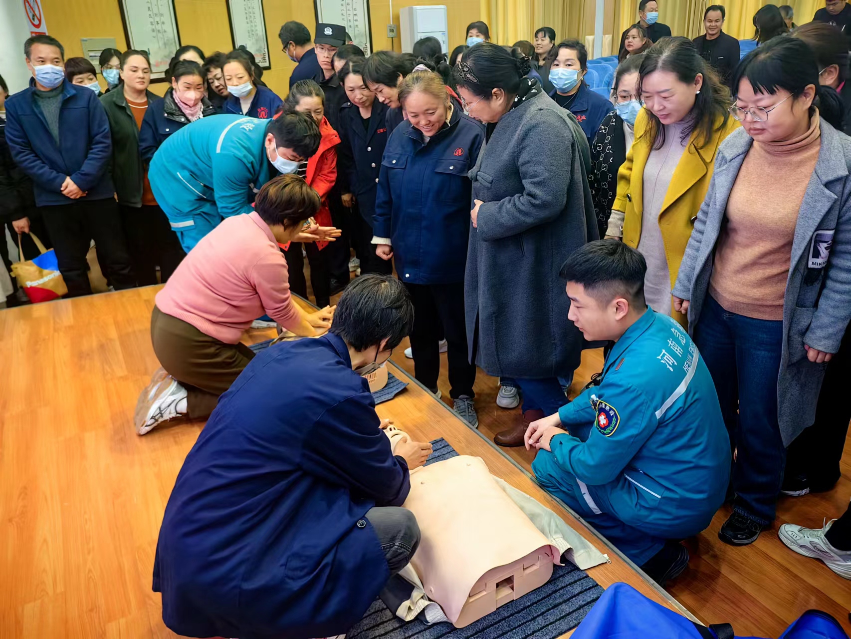 培训会上,符会妮详细讲解急诊急救表征和急诊急救实施方法。高冉详细讲解心肺复苏操作步骤、AED的操作使用方法,并引导师生进行模拟急救实操。