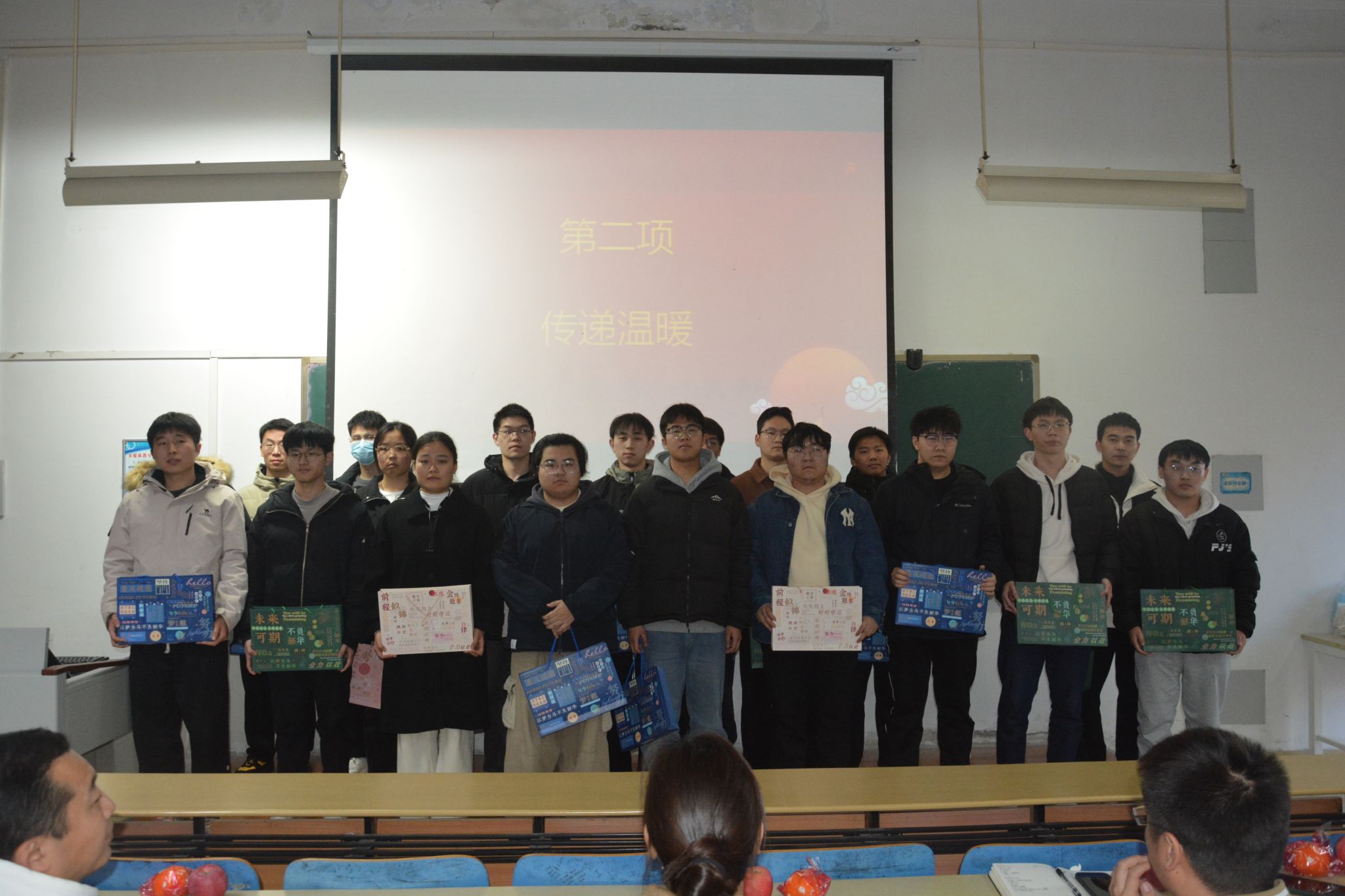 现场播放了低年级同学以及2019级考研成功同学录制的祝福视频,视频充满对考研同学的深深祝福和美好期望。社团同学向考研同学送上特别的祝福礼品,代表着他们的一份心意,祝福考研学子心想事“橙”,“苹”稳上岸。礼盒中不仅有精美的文具,更有学弟学妹们在贺卡上写下的真诚祝福,为勇于拼搏的考研学子们加油鼓劲。
