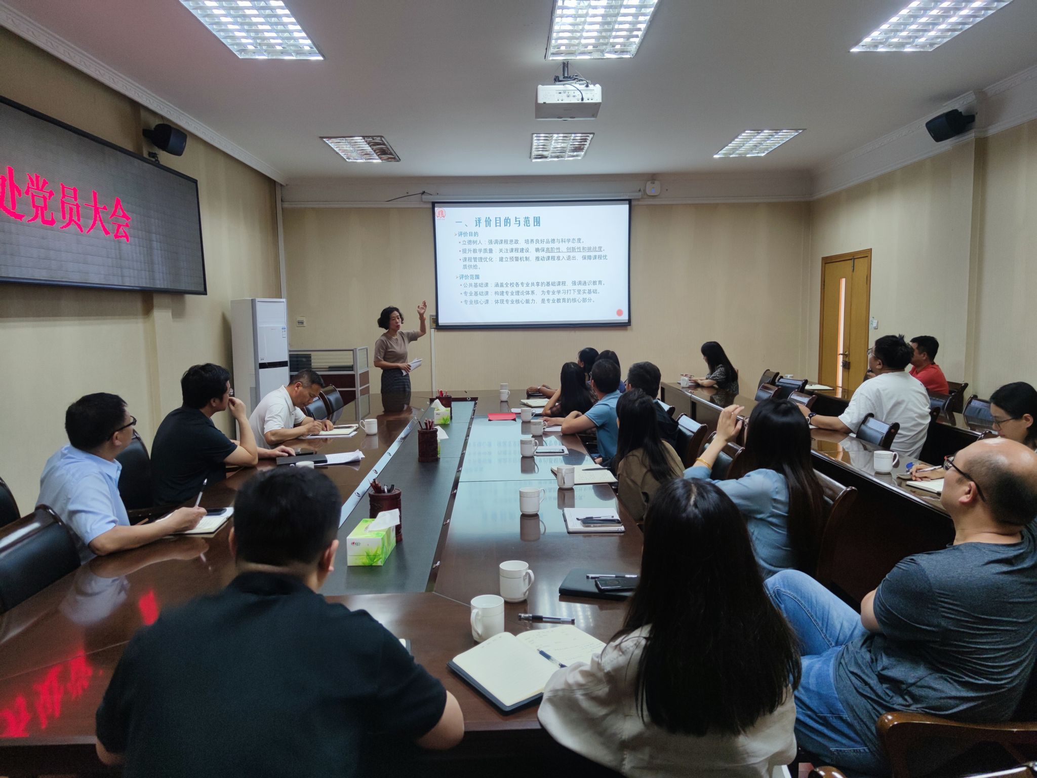 外国语学院商务英语教研室负责老师,从课程质量评价的目的、原则、程序、评价运用机制等方面对文件精神进行深入解读。她表示,此次课程评价对全体教师是挑战也是机遇,有效的课程自评、学校复评、省级复核将有助于推动学校整体教学质量的提升。