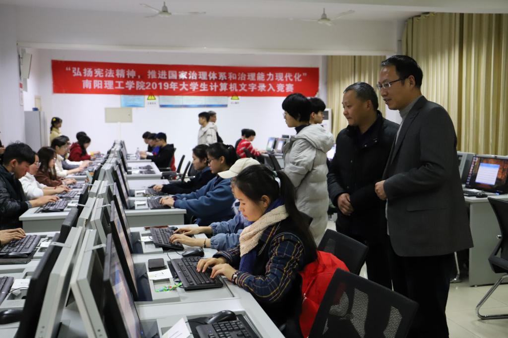 本网讯(特约记者/张清)12月4日晚,以“弘扬宪法精神,推进国家治理体系和治理能力现代化”主题的2019年大学计算机文字录入竞赛校级决赛在电子商务学院9306、9307举办,学生处副处长赵东江、电子商务学院党总支书记逯忆现场观赛,全校各教学院90名选手参赛。