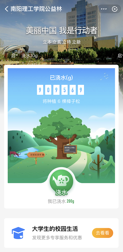 本网讯(特约记者/张雨爽)11月20日,安博官方网页版公益林在支付宝蚂蚁森林小程序正式上线。截至20日晚10点,公益林“日浇水量”达到559.5kg,位列学校类公益林第三位,河南省学校类公益林第一位。