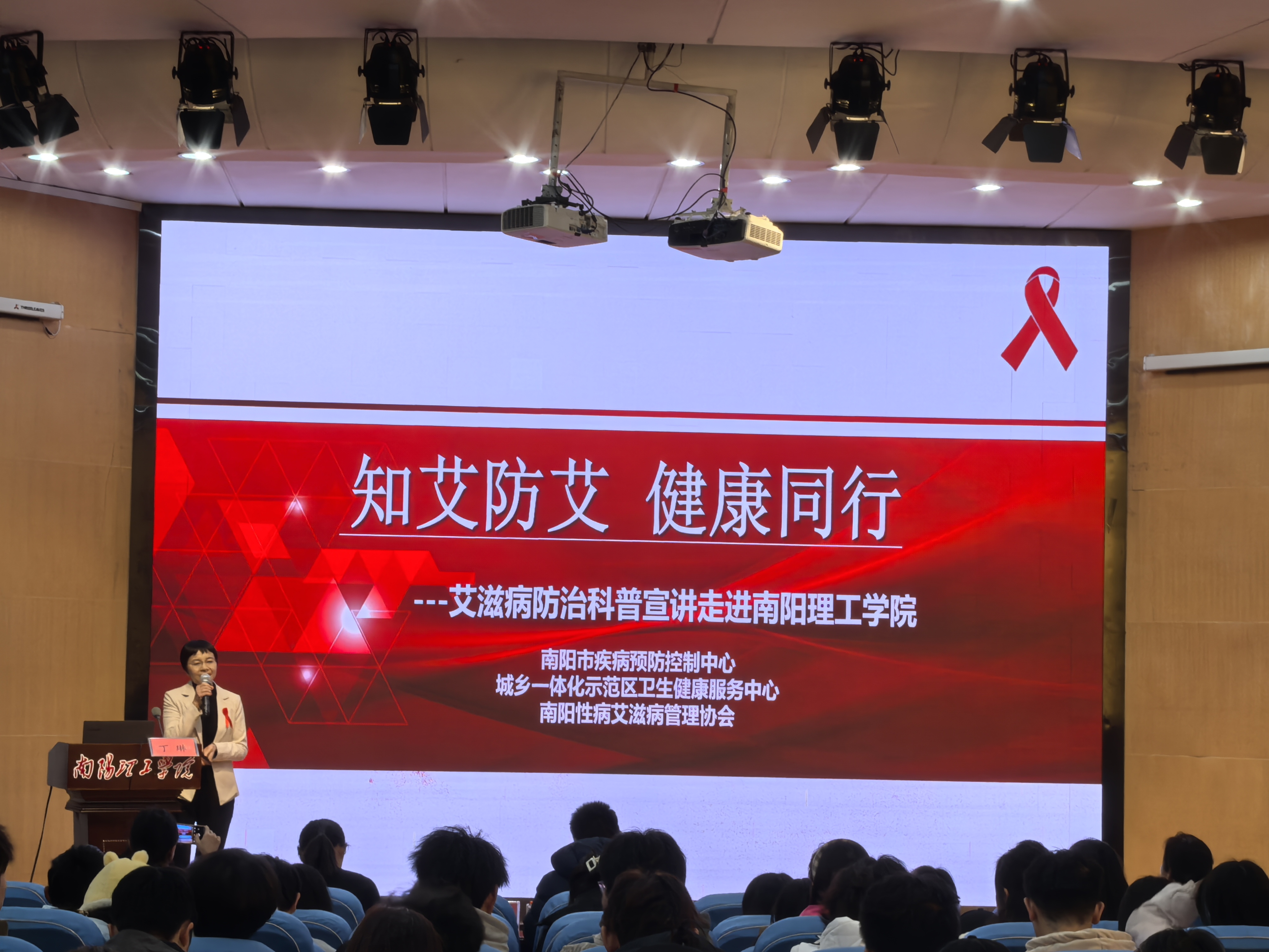 在宣教活动中,南阳市疾病防控中心艾防科丁琳以详实的数据、生动的故事和真实的实例,从“当前青年学生艾滋病感染状况与原因、充分认识艾滋病和青少年如何预防艾滋病”三个方面,为在场400余名师生进行相关知识的宣教和普及。我校健康教育同行社的两名红丝带志愿团成员分别从大学生如何正确预防艾滋病和如何采取相关措施防控艾滋病毒的传播等方面进行宣讲。